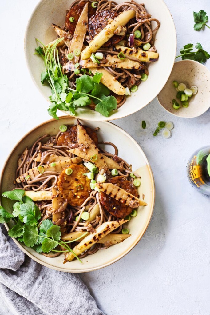- Schep de gemarineerde asperges met de marinade en de gebakken tempé door de noedels. Garneer met de lente-ui en koriander. Serveer direct.