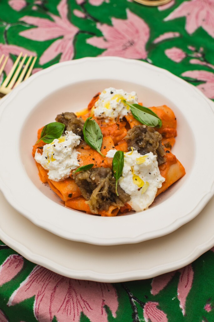 Paccheri met cherrytomaten, burrata en gerookte aubergine