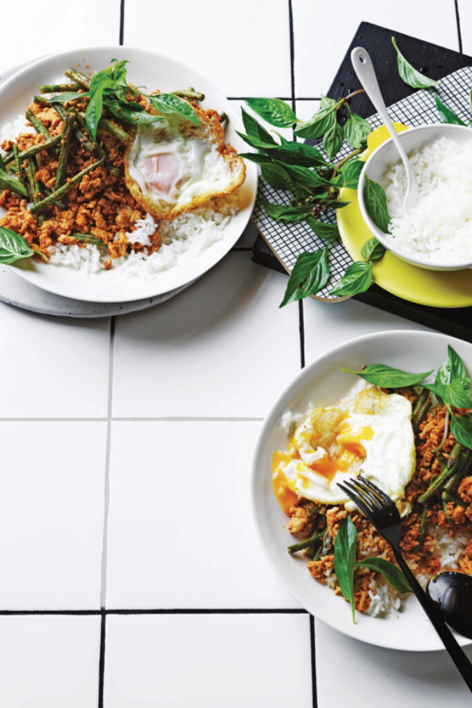 - Serveer met gestoomde rijst in kommen, schep het gehaktmengsel erop, garneer met extra basilicum en leg er een gebakken ei bovenop.