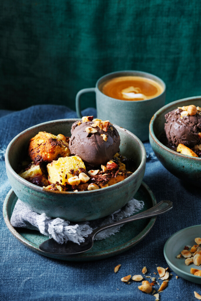 - Verdeel de stukken panettone over de schaaltjes. Verdeel dan de stukjes chocolade en de kersen erover en schenk de gesmolten boter erover. Laat 5-10 min. intrekken. Overgiet de panettone zo gelijkmatig mogelijk met het eimengsel en laat het ± 15 min. intrekken. Dek de ovenschaaltjes af met aluminiumfolie en zet ze op een bakplaat. Bak 30-40 min. tot het eimengsel is gestold maar nog wat wiebelig is. Bestrooi met de hazelnoten en serveer warm met ijs.