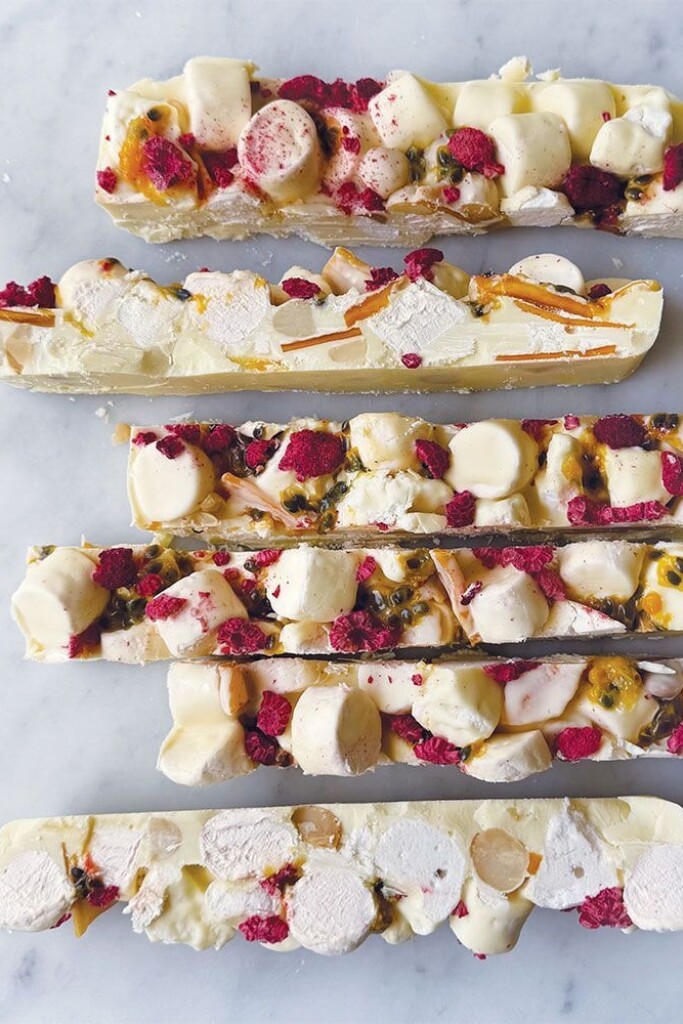 - Voeg de marshmallows, meringue, macadamianoten en mango toe aan de chocolade. Roer alles goed door elkaar. Schep het mengsel in de bakvorm en druk het gelijkmatig aan. Druppel de passievruchtpulp erover en strooi de frambozen erop. Zet minstens 2 uur in de koelkast of totdat het stevig is.