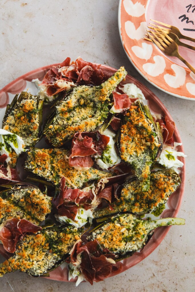 Dit is een voorgerecht voor 4-6 personen of een appetizer voor 6-8. De artisjok is een prachtige groente met een uitzonderlijke smaak. Het is dan ook jammer dat veel mensen zich geïntimideerd voelen bij het idee om artisjokken te bereiden. Ik kan je echter verzekeren dat dat uitdagend lijkt, maar eenvoudiger is dan je denkt. Ik serveer deze artisjokken uit de oven met pata negra en buffelmozzarella. Zo heb je een soort appetizer plate voor jezelf en je gasten om van te genieten. De rijke smaken van de ham vullen de aardse smaak van de artisjok prachtig aan en de kaas zorgt voor een romige toevoeging.