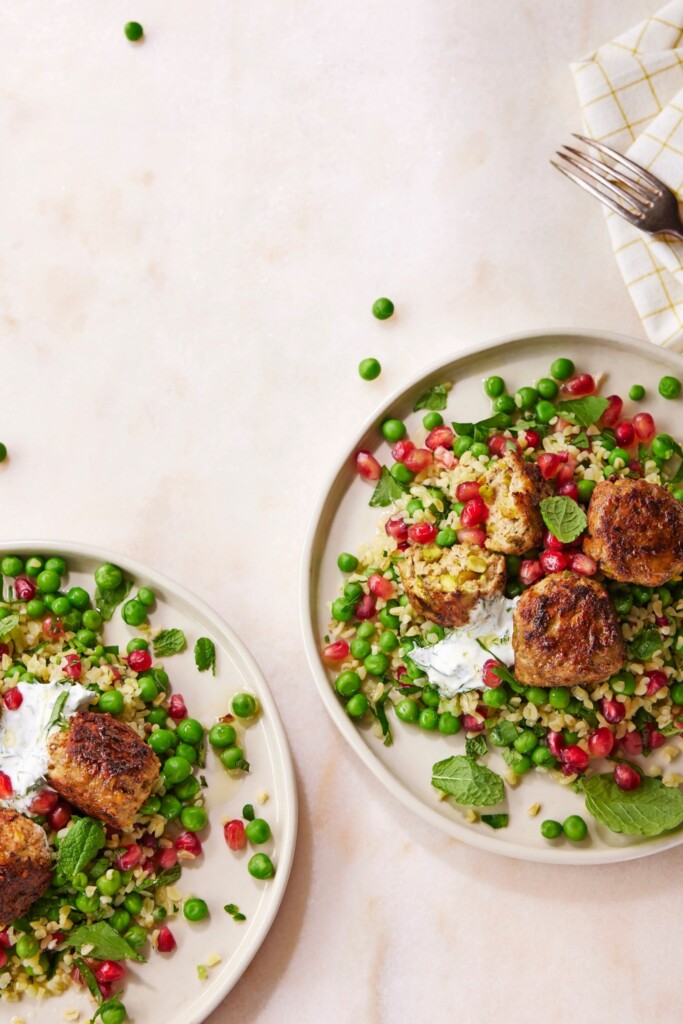 - Kook de bulgur met 1 el ras el hanout volgens de aanwijzingen op de verpakking. Kook de laatste 3 min. de doperwten mee. Giet af en breng op smaak met het limoensap, peper en zout. Schep bijna alle kruiden en de granaatappelpitjes door de tabouleh.