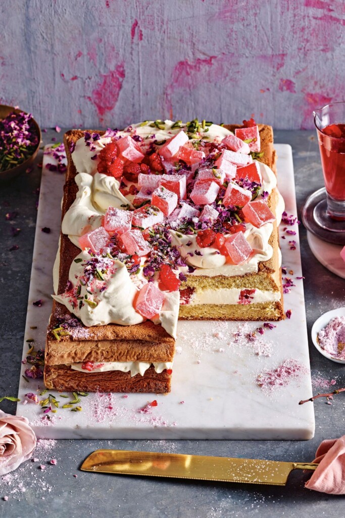 - Garneer de taart met verse frambozen, Turks fruit, pistaches en gedroogde rozenblaadjes. Verdeel het frambozenstrooisel erover en besprenkel met de rest van de siroop.