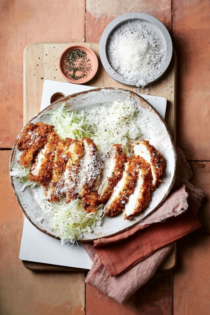- Bak de gepaneerde kip in 5 min. per kant goudbruin en knapperig. Leg op het bakrooster en bak nog 8 min. in de oven. Bestrooi met Parmezaanse kaas, zeezoutvlokken en versgemalen peper. Serveer met fijn geschaafde witte kool.