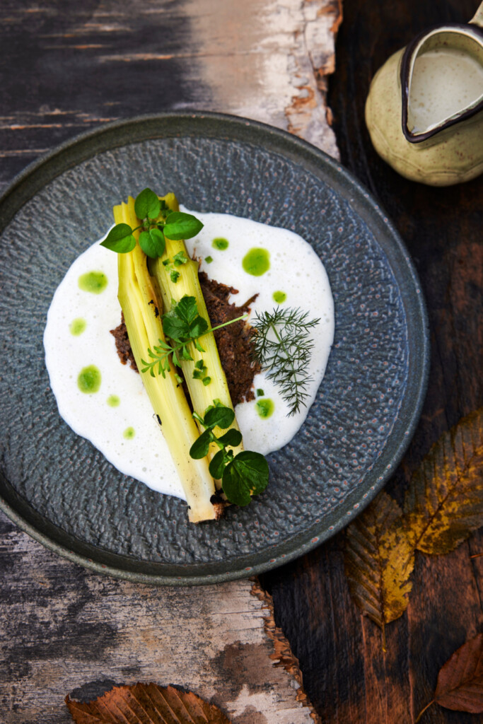 7. Schep wat romescosaus op een bord, schenk de rauwmelkse saus eromheen – schuim eventueel op met de staafmixer – leg één of twee preien erop. Bedruppel met de prei-olie, weinig kosho en bestrooi met wat wilde kruiden.