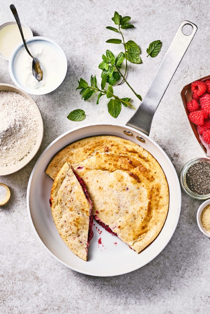 Next level lekker! Bouw een stapel van deze pannenkoeken om je ochtend te starten met extra veel proteïne. Maak een dubbele portie van de frambozen-chiajam want die is ook verrukkelijk op een stuk baguette of door de yoghurt. Tip: heb je geen ovenbestendige pan? Dan kun je dit ook in een ronde bakvorm maken. Nog meer pannenkoekeninspiratie!