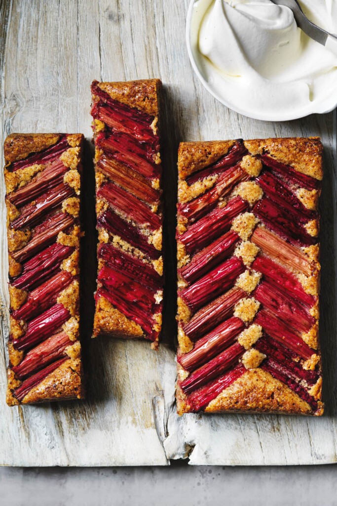 Zachte amandelcake met frisse rabarber en een sticky gekaramelliseerd dakje. Heb je al trek gekregen?