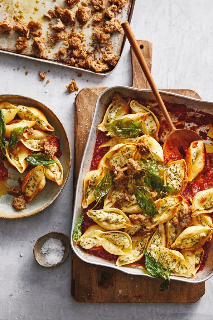 TIP Als je na het vullen nog gekookte schelpen overhoudt, kun je ze als eerste in de ovenschaal leggen en de gevulde pastaschelpen erop leggen.
