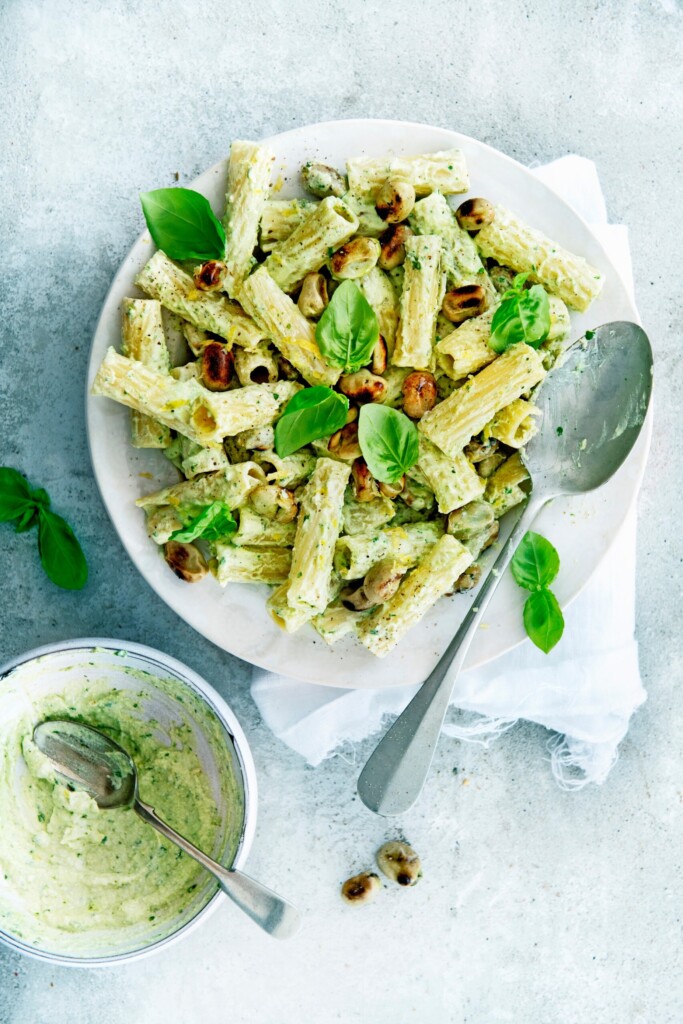 - Giet de pasta af en vang een kop kookvocht op. Schep de pesto met een scheut kookvocht door de pasta. Schep de tuinbonen erdoor en schep de pasta op 4 borden.