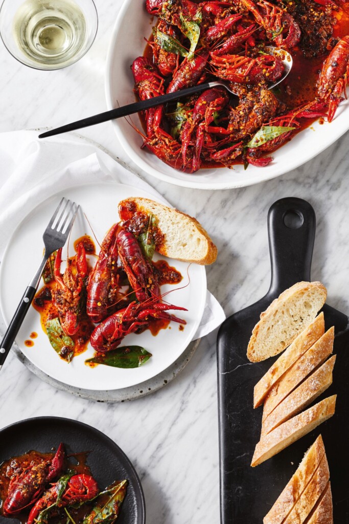 - Neem de rivierkreeftjes met een schuimspaan uit de pan, laat iets uitlekken en schep ze door het chili-oliemengsel. Meng goed door tot alle boter is gesmolten. Serveer meteen met brood om de saus op te deppen.