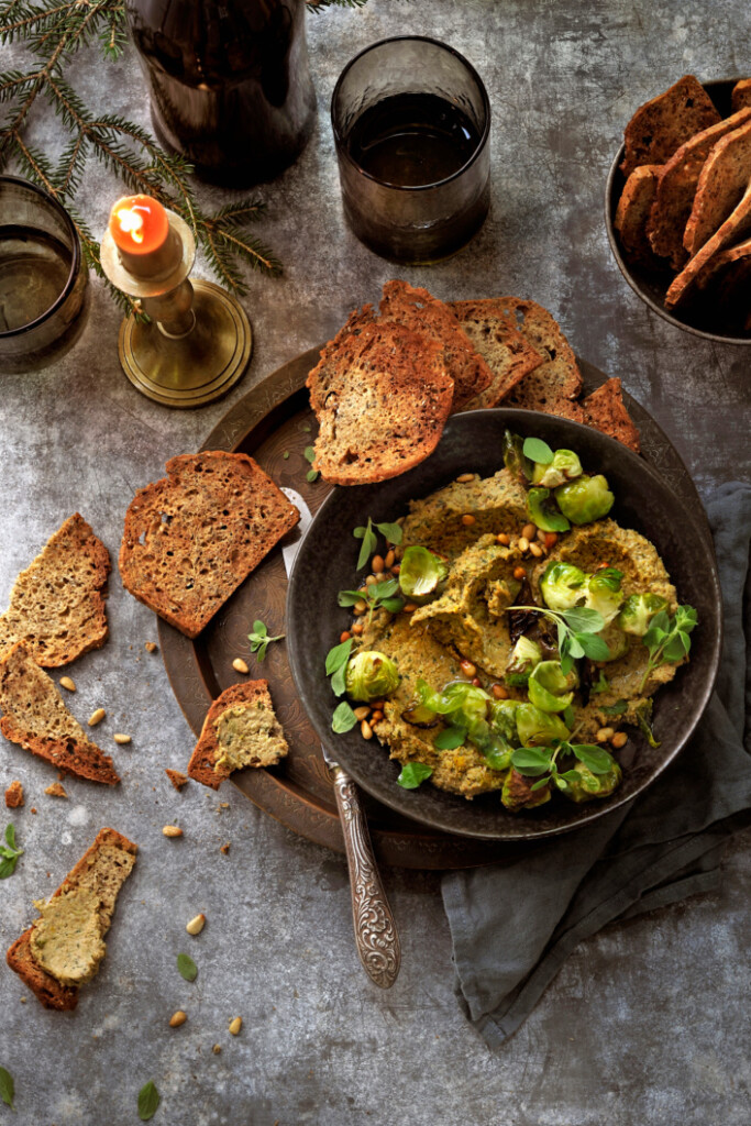 Deze rommelige dip van geroosterde spruiten & pijnboompitten is heerlijk te serveren met wat lekkere crackers!