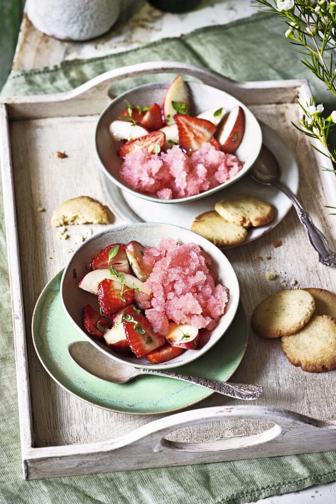 Rosé granita met zomerfruitsalade & tijm-honingkoekjes