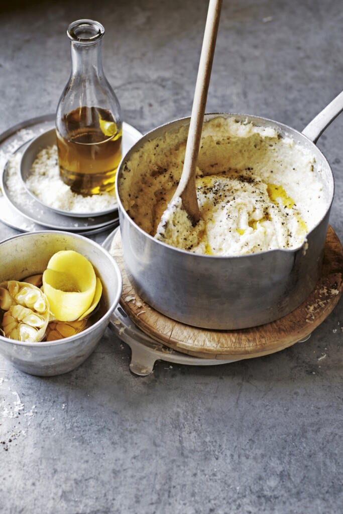 Cacio e pepe – oorspronkelijk een Romeinse klassieker van spaghetti met louter zwarte peper en pecorino – is nu weer een trend. Wij maken er een bijgerecht van: grove gries + parmezaan & pecorino + melk & boter + zwarte peper = een topcombinatie.