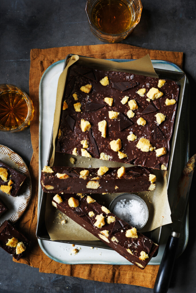 Met stukjes pure chocolade en in whisky geweekte koekjes krijgt deze chocolade-fudge een bijzondere textuur. Wij nemen hiervoor whisky uit de Schotse Hooglanden. Begin 1 dag eerder aan dit recept.