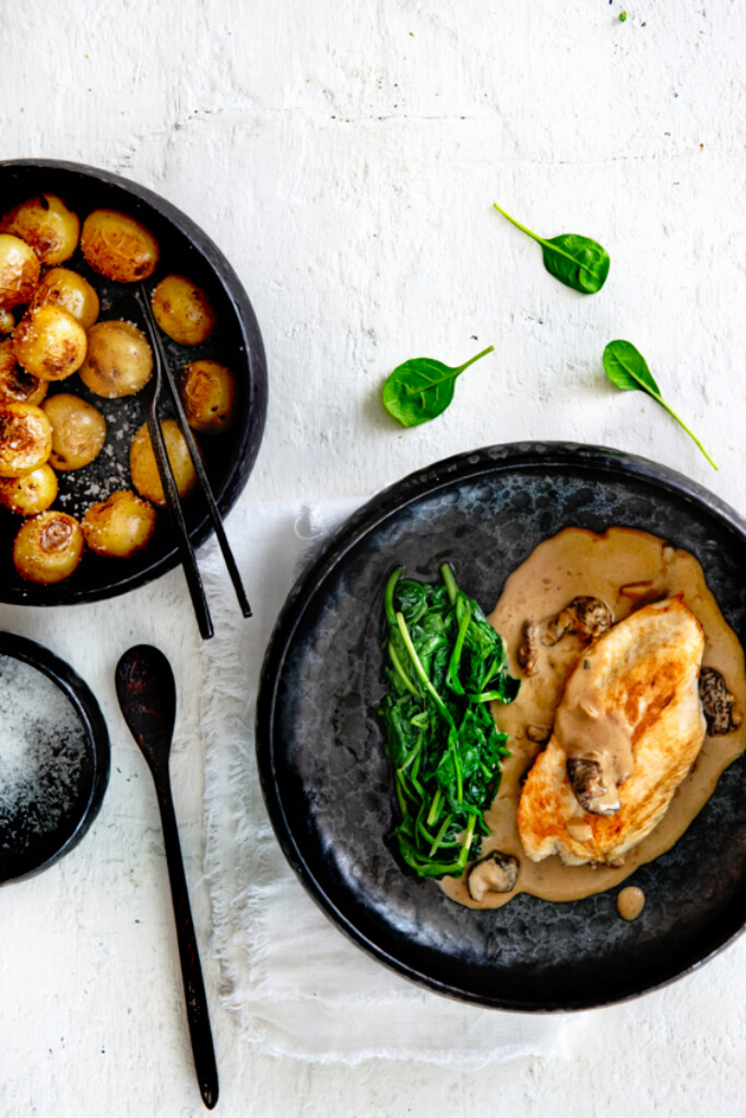 - Schep de spinazie op de borden. Verdeel de kipfilets met de morillesaus erover en serveer met de krieltjes.