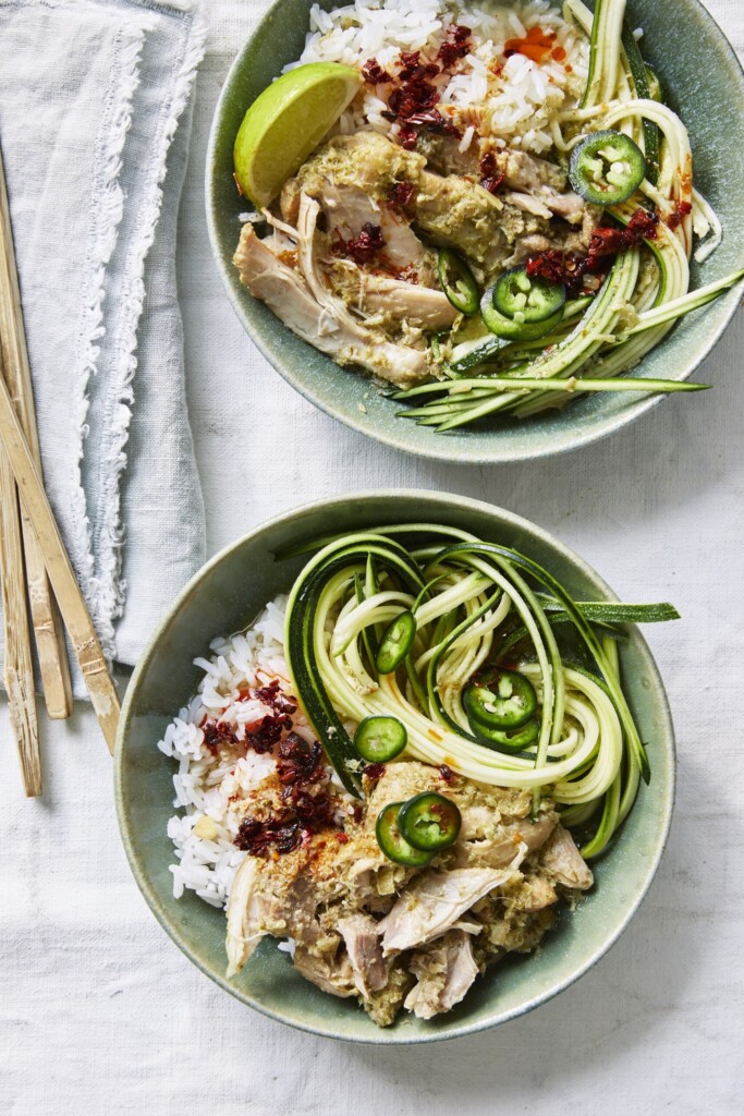 - Serveer de kippenstoof boven op de courgettenoedels en serveer met gestoomde rijst, chiliolie, de overige jalapeño’s, limoenpartjes en muntblaadjes.