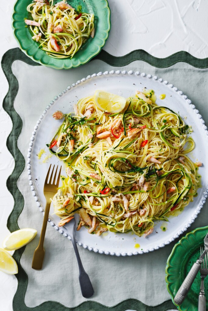 - Verhit intussen de olie in een grote koekenpan met zware bodem op matig vuur. Bak hierin de pepers en knoflook ± 3 min. onder af en toe omscheppen tot de aroma’s vrijkomen. Schenk de wijn erbij en roer 2 min. Voeg de courgettes, tijm en 250 ml van het pastakookwater toe en breng aan de kook. Schep op hoog vuur ± 2 min. om tot de courgette gaar is. Voeg de krab, spaghettini en peterselie toe en schep nog 3 min. om tot de pasta beetgaar en goed met de saus bedekt is. Proef en voeg zo nodig nog wat zout en versgemalen peper toe. Serveer met de citroenpartjes.
