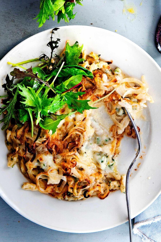 - Schep de spätzle met een schuimspaan uit de pan in 4 ingevette eenpersoonsovenschaaltjes. Verdeel de uiringen erover. Schep de kaasroom op de uiringen. Bak de spätzle 20-25 min. in de oven, tot de roomlaag goudbruin kleurt en bubbelt.