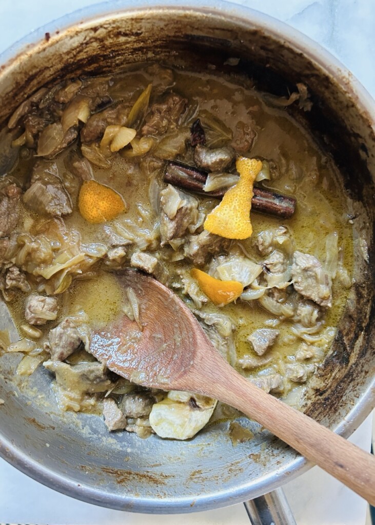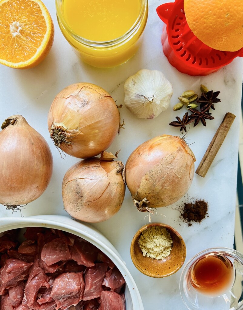 - Snijd de uien fijn en evt. het vlees in stukken. Halveer de bol knoflook. Verhit de olijfolie of boter en voeg de uien en het vlees toe. Voeg de knoflook, het kaneelstokje, de steranijs, het gember- en kruidnagelpoeder, de kardemompeulen, rodewijnazijn en genoeg zout toe.