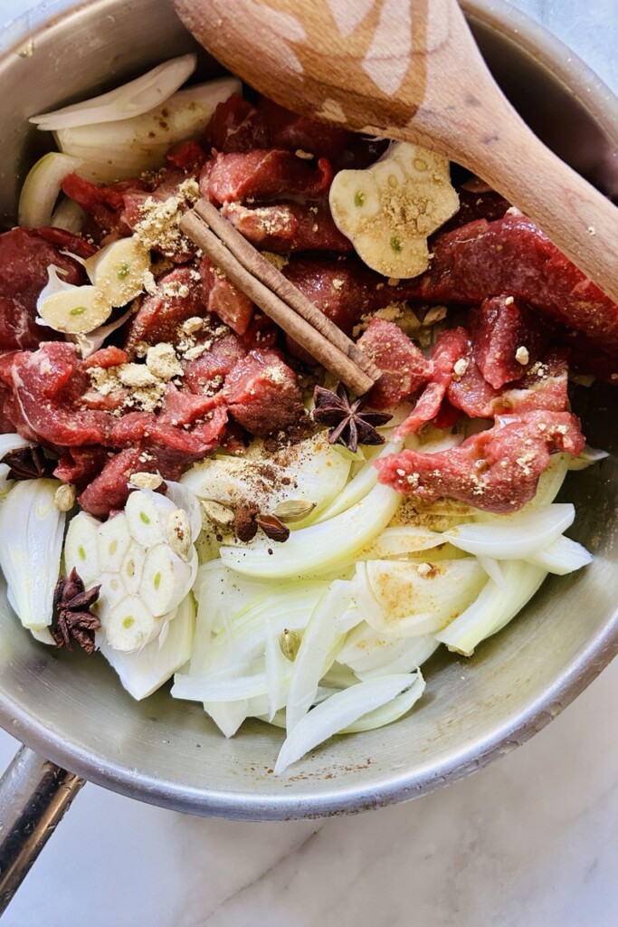 - Snijd de uien fijn en evt. het vlees in stukken. Halveer de bol knoflook. Verhit de olijfolie of boter en voeg de uien en het vlees toe. Voeg de knoflook, het kaneelstokje, de steranijs, het gember- en kruidnagelpoeder, de kardemompeulen, rodewijnazijn en genoeg zout toe.