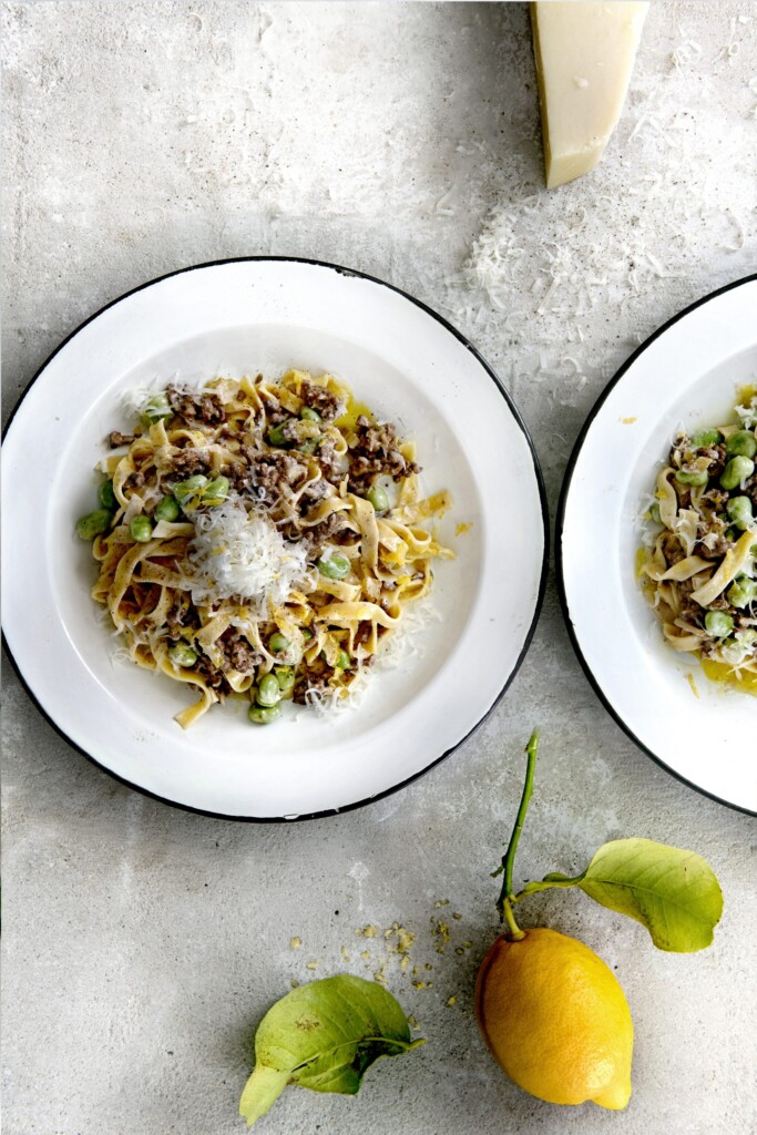 - Schenk de slagroom bij het gehakt en breng aan de kook. Draai het vuur laag. Roer de helft van de pecorino door de saus. Schep de tagliatelle en de tuinbonen door de saus. Breng op smaak met zout en peper.