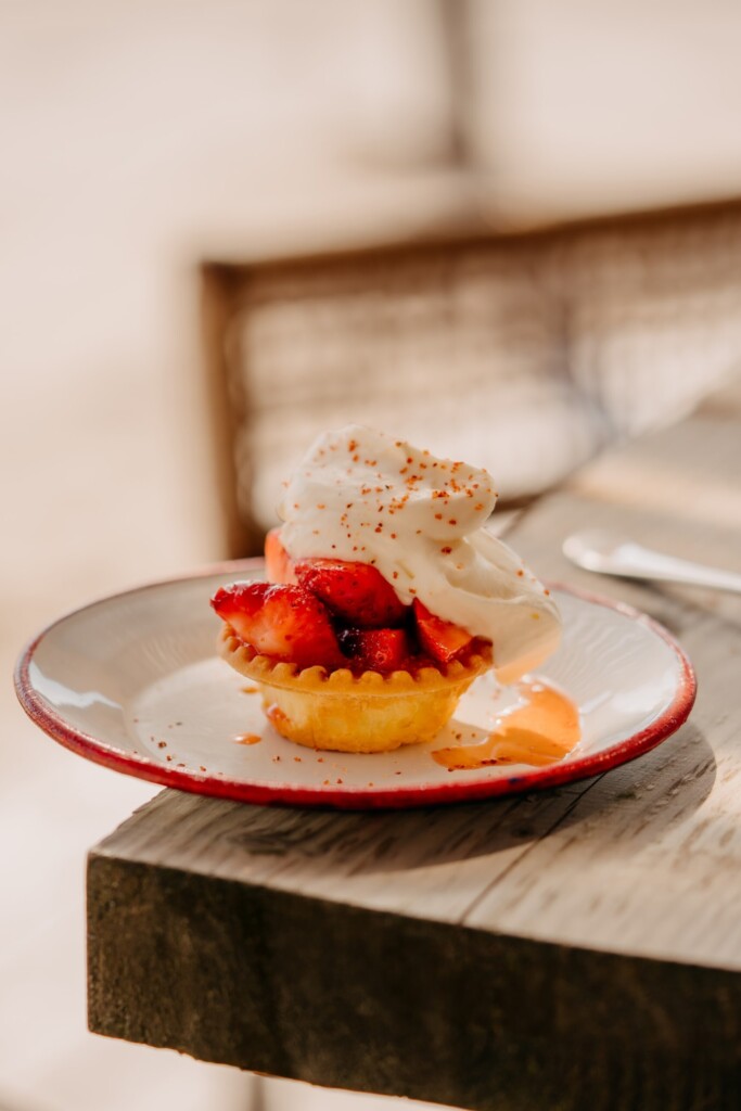 - Klop voor de room de slagroom lobbig met de suiker. Vul de tartelettes tot de helft met karamel, verdeel er de aardbeien over en schep hier royaal de lobbige room bovenop. Garneer met extra tajín, de limoenrasp en een paar zoutvlokken.