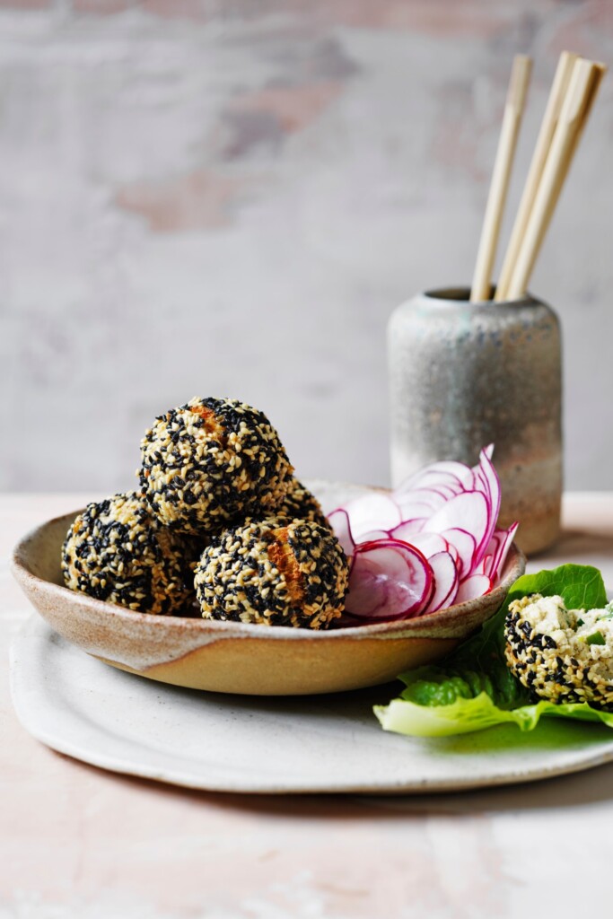 - Meng het sesamzaad in een diep bord. Roer de eieren los in een ander diep bord. Strooi de maizena in een derde diep bord. Wentel de balletjes een voor een eerst door de maizena, dan door de losgeroerde eieren en tenslotte door het sesamzaad.