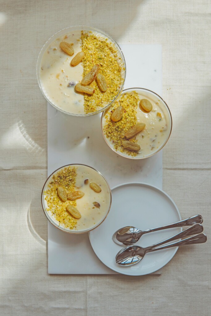 - Schenk de vla in 4 glaasjes en laat in 2 uur koud worden in de koelkast. Verdeel de gewelde rozijnen (evt. met de raki) en de fijn gehakte pistachenoten erover en serveer.