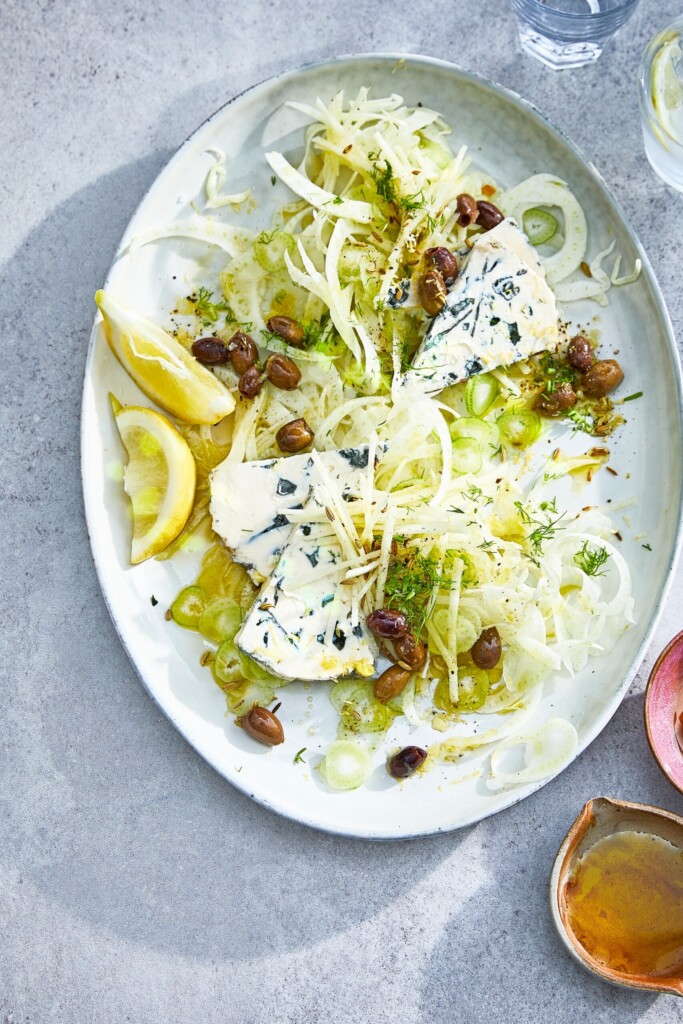- Verdeel de appeljulienne en blauwe kaas erover. Bestrooi met het venkelzaad en de olijven. Besprenkel met wat extra frisgroene olijfolie en verdeel het venkelgroen erover.