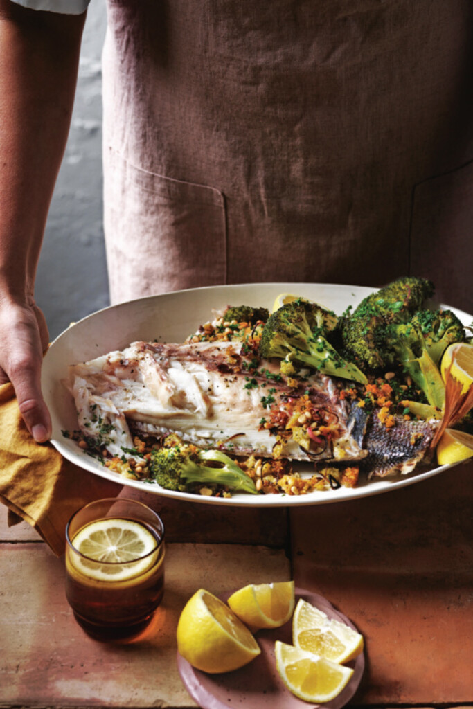 - Leg de vis op de bakplaat en sprenkel de resterende olie erover. Bak de vis in 25-30 min. gaar. Leg de vis op een schaal en laat even rusten. Schep de gepekelde citroenschil en pijnboompitten door het broccoli-kruimelmengsel. Bestrooi met peterselie en serveer met citroenpartjes bij de vis.