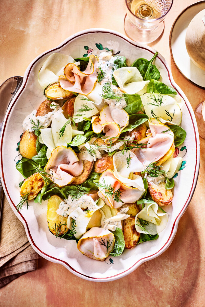 - Verdeel de spinazie en geroosterde krieltjes over een grote schaal. Drapeer de plakjes koolrabi en fricandeau ertussen en besprenkel met de overgebleven dressing. Verdeel er dotjes tonijnsaus over en garneer met de rest van de dille.