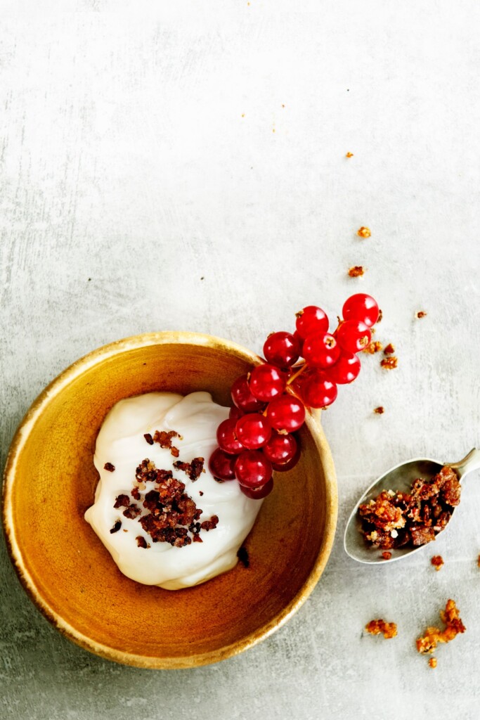 - Schep de skyr op 4 borden. Verdeel de bessen erover en bestrooi met de krokante rogge-kardemomcrumble.