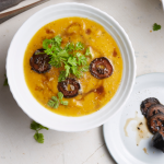 Zintuigen kunnen je bedriegen… je ruikt en proeft tomatensoep, maar wat je in je bord ziet, is helemaal helder. Deze heldere tomatensoep – consommée is de chique naam – kun je heel makkelijk 1 dag van tevoren maken en later langzaam verwarmen. De soep is vegan, maar ook heel lekker met in elk bord een kort gegrilde coquille.In Japan zijn ze ook meesters in het maken van lichte, heldere soep met groenten. Probeer deze ook eens!