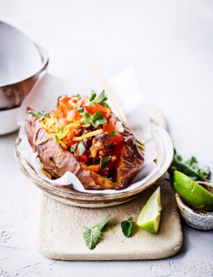 gepofte zoete aardappel met chili con carne, salsa, koriander & kaas