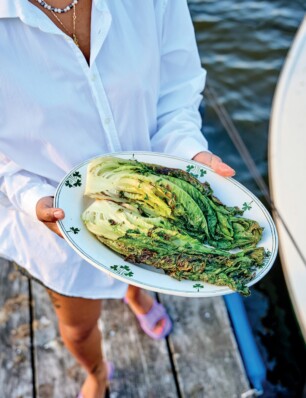 gestoofde andijvie met kikkererwten, jonge knoflook en zwarte olijven