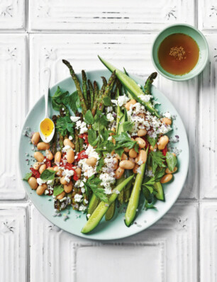 salade van geroosterde groene asperges met pistache en citroen-tijmdressing