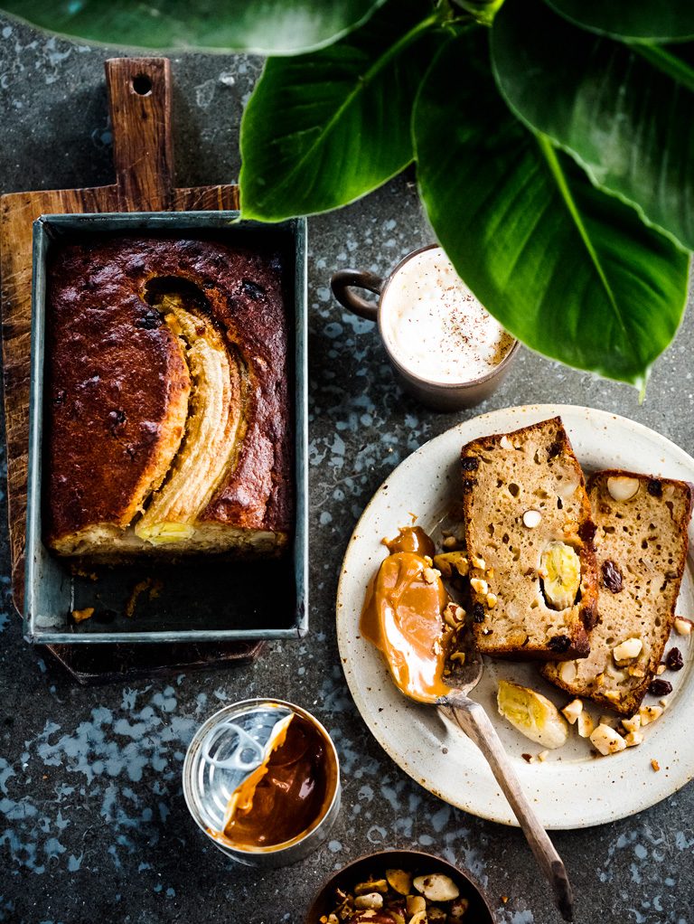 bananenbrood met noten en karamelsaus