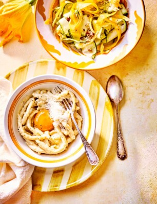 gnocchi pici cacio e pepe met gekonfijte eidooier en courgettesalade
