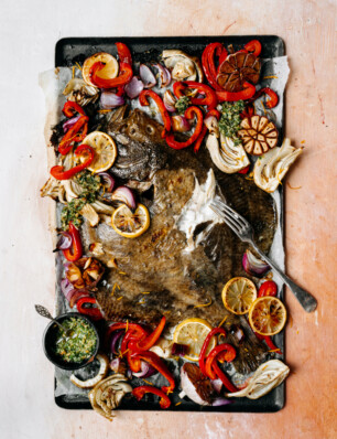 tarbot uit de oven met geroosterde groenten en dragonpesto