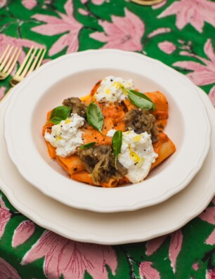 paccheri met cherrytomaten, burrata en gerookte aubergine