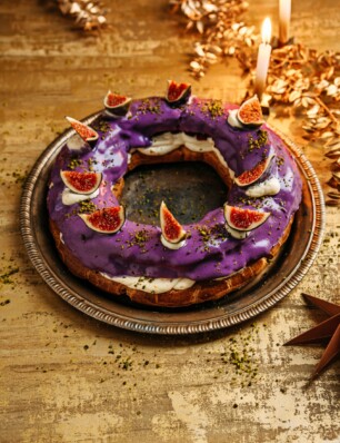 Paris-Brest met mandarijncrème, stoofpeer en bramenglazuur