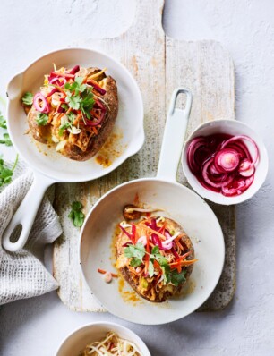 gepofte aardappel met Thaise curry, pulled chicken, taugé & rode ui