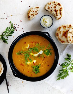 bospeen-honingsoep met gemberyoghurt en minipita’s