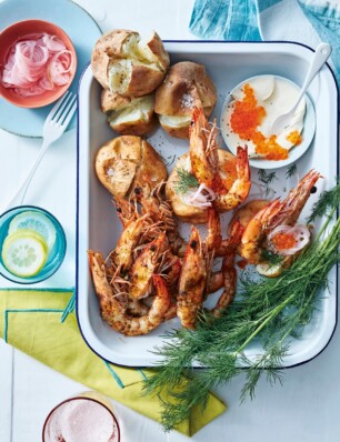 garnalen van de bbq met aardappels, zalmkuit & zoetzure sjalotten