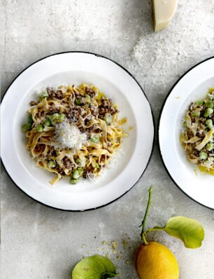 tagliatelle al ragù bianco e fave (met kalfsvlees en tuinbonen)